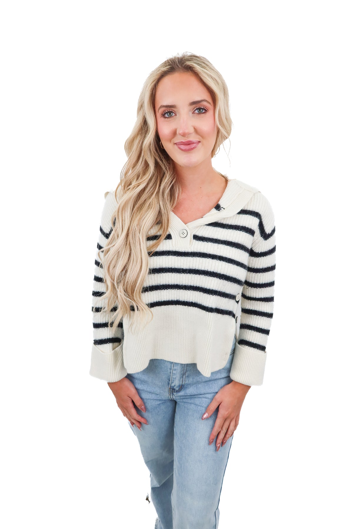 black and white striped sweater, button front/sides